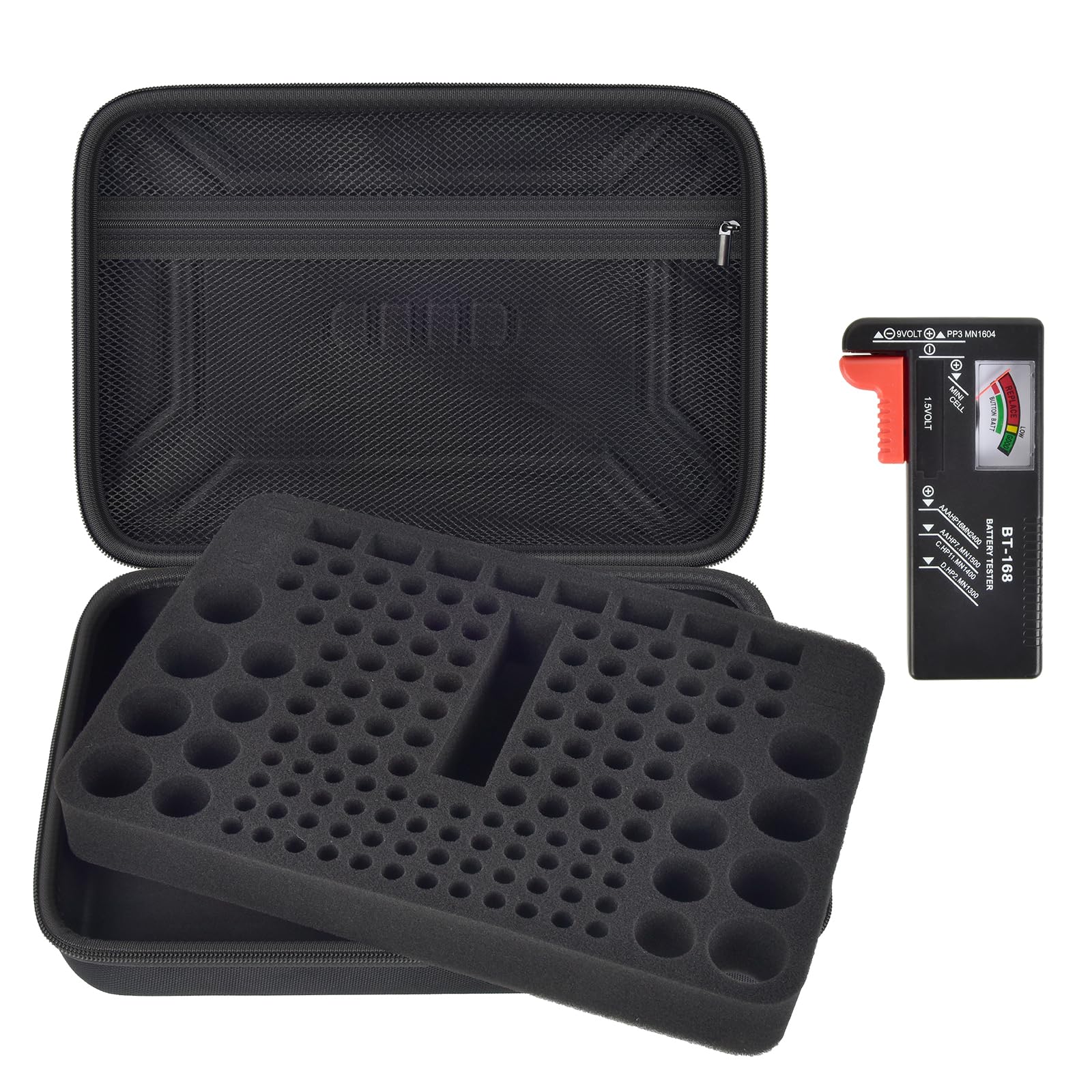 Battery organizer with large capacity and classified: The battery box can accommodate 66*AA, 48* AAA, 20* button, 8* C, 8* D, 8* 9 volt battery, and also comes with a mesh bag to meet the large battery storage needs of different users. Internally designed with multiple compartments and slots of different sizes to avoid collisions and confusion between batteries, especially suitable for home users to store batteries variety pack, Includes Battery Tester