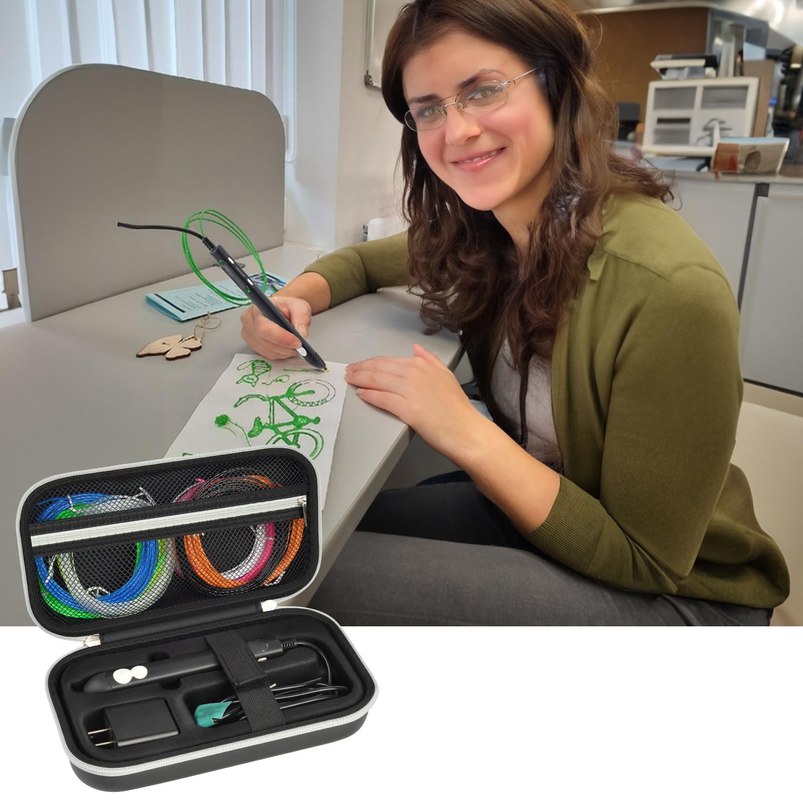 The storage has customized grooves for 3doodler flow for 3d printing pen and the power adaptor, and there is also a zippered mesh pocket for 3d pen filament refills, to keep all your creative accessories in one place. (For sale is case only, not include the device)